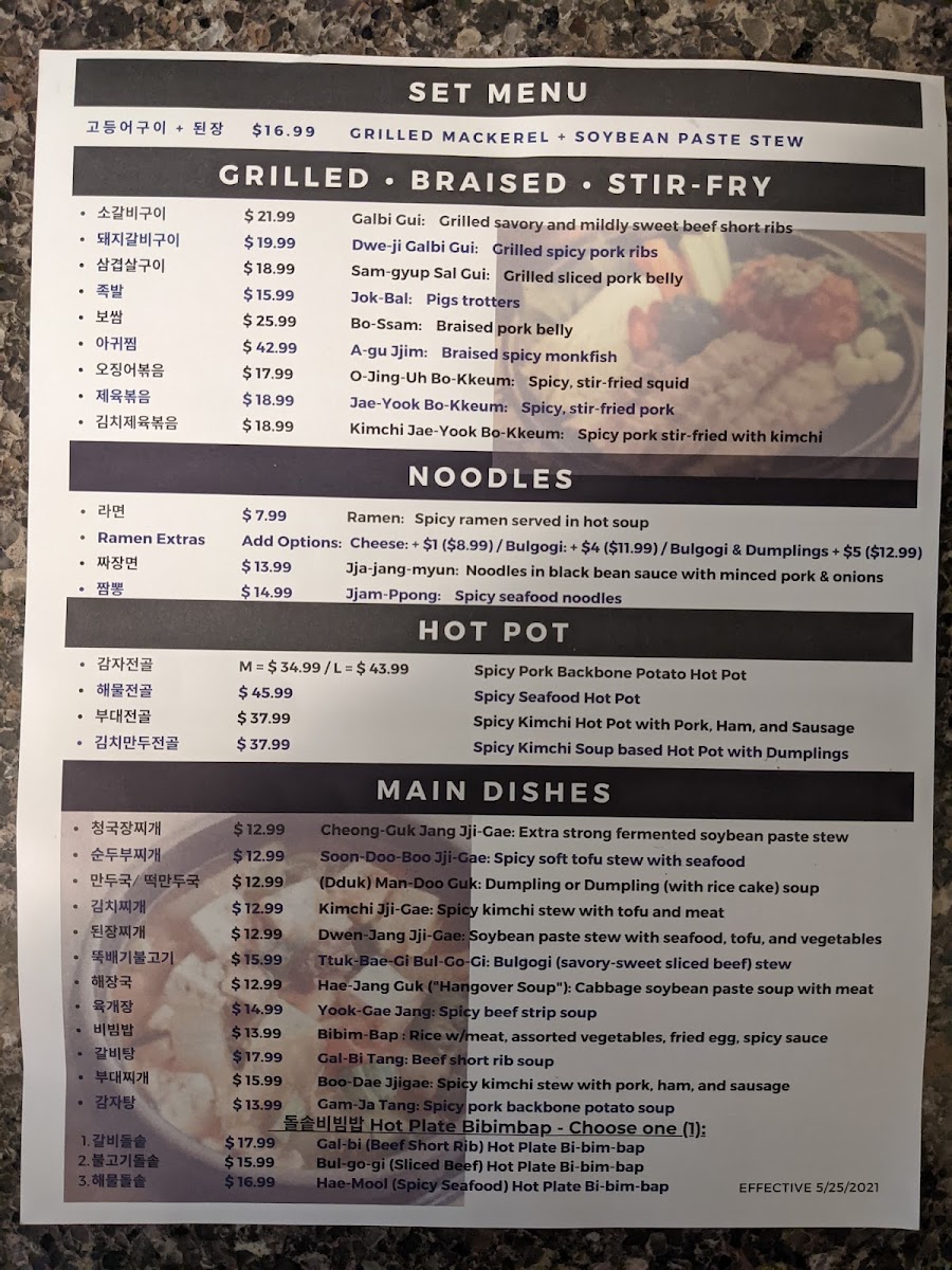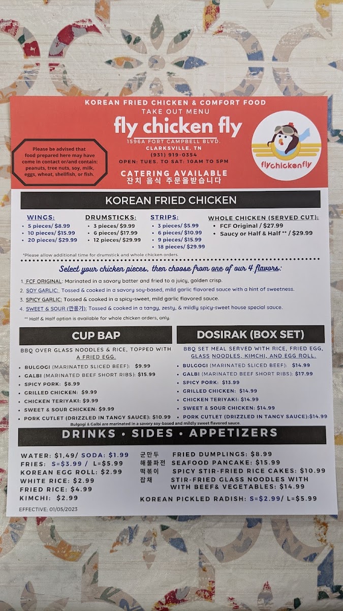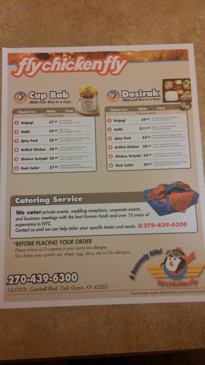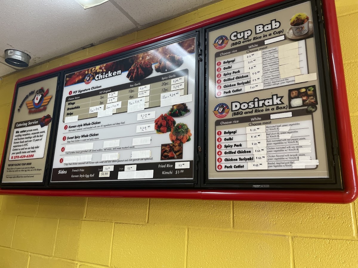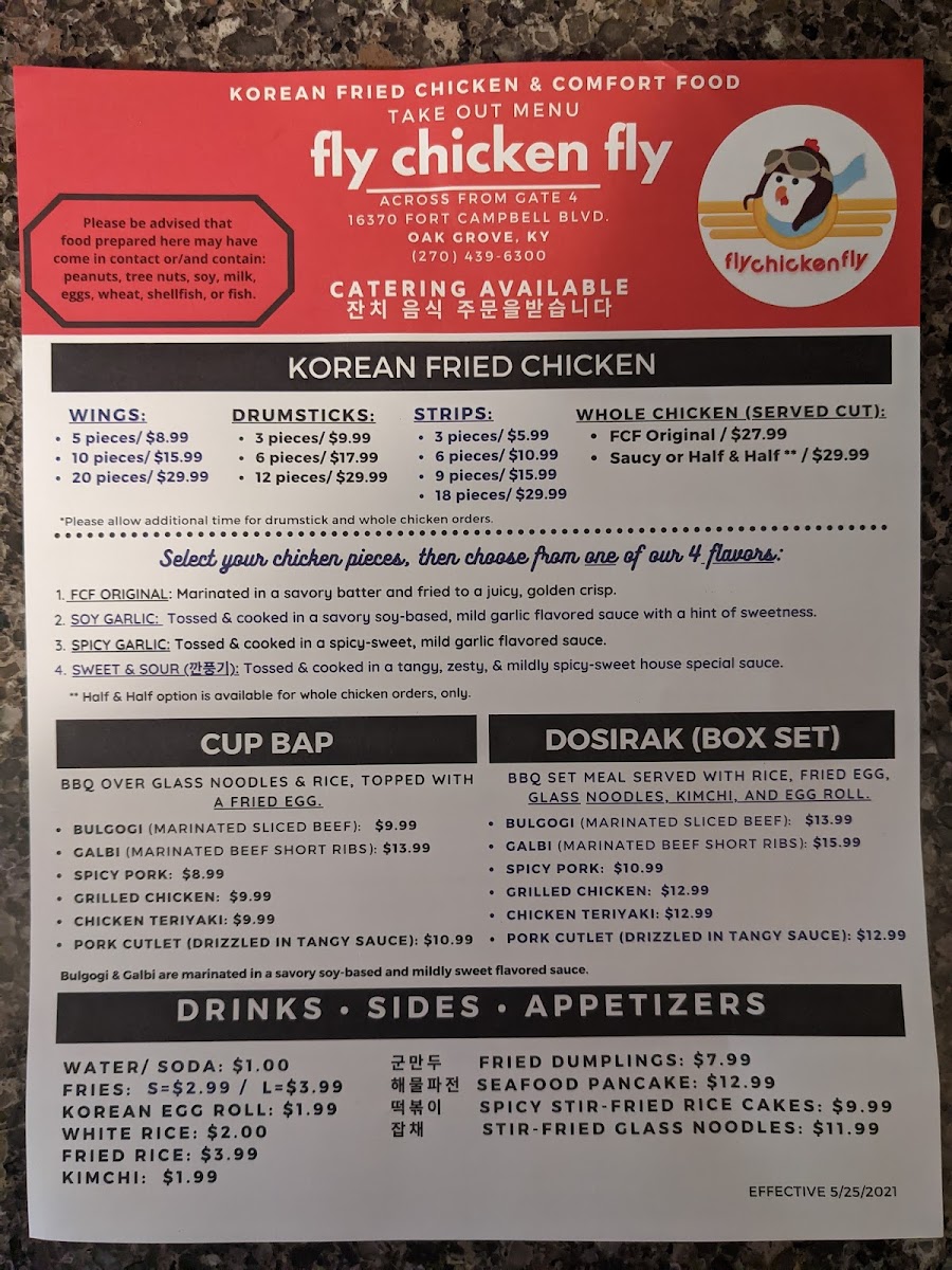 The menu at Fly Chicken Fly offers a delightful fusion of Korean and American flavors, with a variety of appetizers, sides, and main dishes. For appetizers, diners can enjoy crispy 군만두 (fried dumplings) or opt for Korean Style Egg Roll, which pairs perfectly with the sides like French Fries or the tangy Pickled Radish. The Fried Rice and Kimchi add a nice balance of flavors to any meal. The chicken offerings are a highlight, with options like Strips or flavorful Chicken Teriyaki, Sweet & Sour Chicken, and Grilled Chicken. The Dosirak (Korean lunch box) selections feature savory choices such as Bulgogi, Spicy Pork, and Sweet & Sour Chicken. For those craving heartier dishes, the 뚝배기불고기 (hot stone pot bulgogi) and Jjam-Ppong (spicy seafood noodles) are excellent options. The menu also offers unique main dishes like Korean Style Whole Chicken and Sweet Spicy Whole Chicken, alongside Scallion Chicken for a refreshing flavor. Pair your meal with a Korean Egg Roll or enjoy a Seafood Pancake for an added treat. Whether you’re looking for a quick bite or a full meal, Fly Chicken Fly has something for everyone, with options that cater to different tastes and spice levels.